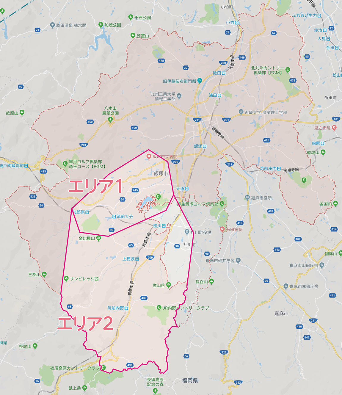 エリア2 北│JR天道駅近辺 東│桂川町役場付近 西│サンビレッジ茜付近 南│夜須高原カントリークラブ手前付近